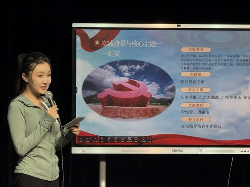 第二位分享者是2023级戏剧影视导演专业的耿艺书,“从延安的宝塔山到福建的林海,两次暑期社会实践让我明白,艺术从来不是孤立的,它是时代的声音,是精神的载体。”在延安,她走过枣园、杨家岭的革命旧址,在鲁艺旧址聆听冼星海创作《黄河大合唱》的往事,探班上戏原创生态话剧《树魂》的驻场演出,感受到对“绿水青山就是金山银山”的生动诠释,也是让大家读懂了“走出课堂,服务人民”的青春意义。“交换不是简单的‘旅游式学习’,而是跳出熟悉的环境,用新的视角审视专业。”