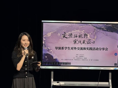 2025年10月23日,由导演系党总支、导演系主办,导演系学生党支部、导演系团总支、导演系学生会、导“眼”艺术观摩团共同承办的导演系对外交流和实践活动分享会在黑匣子剧场顺利举行。党政办、宣传部、学工部团委、教务处、国际交流处、发展规划处、研究生部、演艺中心等职能部门领导嘉宾出席,导演系全系教师观摩,导演系学生参加。本次分享会通过6位学子的亲身讲述,串联起从国内研学、暑期实践到境外交流、国际展演的成长轨迹,为导演系学子搭建起经验传递的桥梁,更展现了青年戏剧人扎根文化、放眼世界的责任与担当。