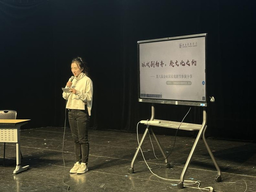 导演系学生党支部宣传委员、2024级戏剧导演艺术研究硕士研究生吴可以“初识・破冰”“深耕・绽放”“融合・回响”三个关键词,分享《赵氏孤儿》在第八届金砖国家戏剧院校戏剧节的演出故事。为了让世界读懂“忠义”“牺牲”的东方哲学,团队在开放的广场舞台上,以戏曲服饰、传统乐器结合现代剧场手法,将经典故事搬上国际舞台。演出结束后,科布松艺术学院校长德米特里・托米林的评价——“中国年轻戏剧工作者对传统文化的创造性转化令人印象深刻”。而在闭幕式上,各国艺术家共同演绎的联合版《赵氏孤儿》,更让吴可深刻体会到“戏剧的根是中国的,枝叶却能伸向世界”。